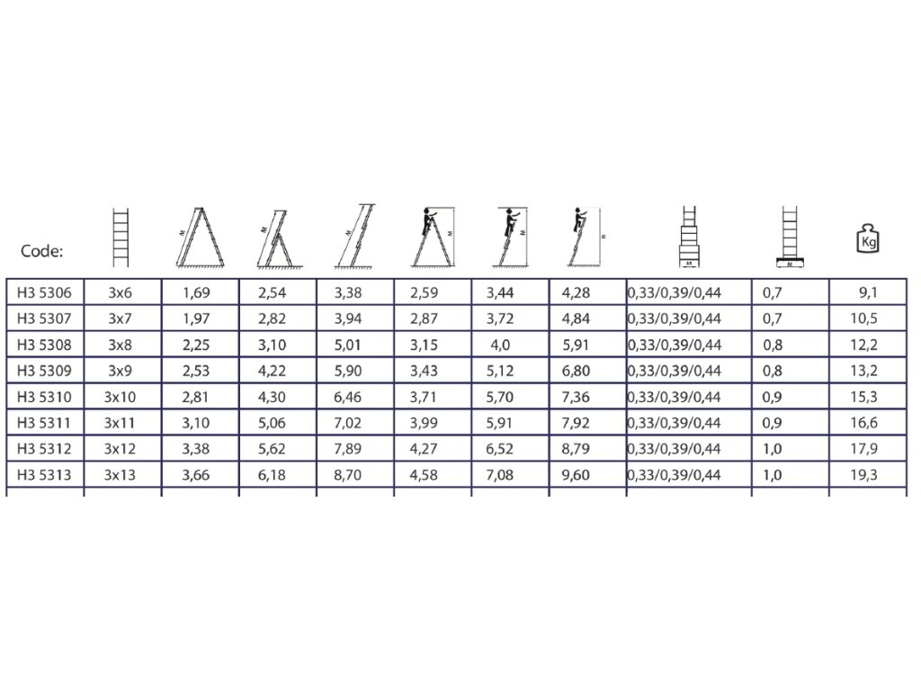 Výška žebříku ve složeném stavu je 2,25 m, výška štaflí je 2,13 m, max. pracovní výška na štaflích je 3,15 m, výška předsunutých štaflí je 3,1 m, max. pracovní výška na předsunutých štaflích je 4 m, výška vysunutého žebříku je 5,06 m, max. pracovní výška na vysunutém žebříku je až 5,96 m.