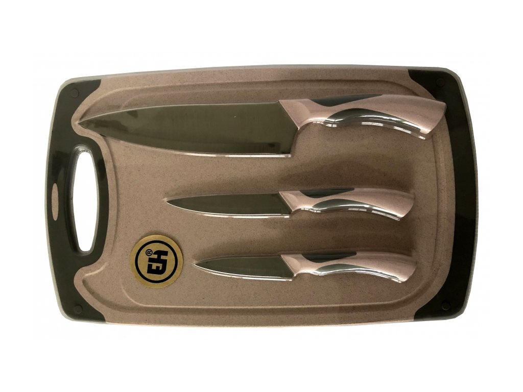 Sada prkénko + 3ks nožů bude mít využití v každé kuchyni. Nože mají ergonomicky tvarovanou rukojeť s nerezovou čepelí. Sada obsahuje prkénko s měkčenými soft okraji proti klouzání a pro příjemný dotek s rozměrem 40 x 24 cm, 1 x kuchařský nůž 34 cm, univerzální nůž 23 cm a loupací nůž 20,5 cm