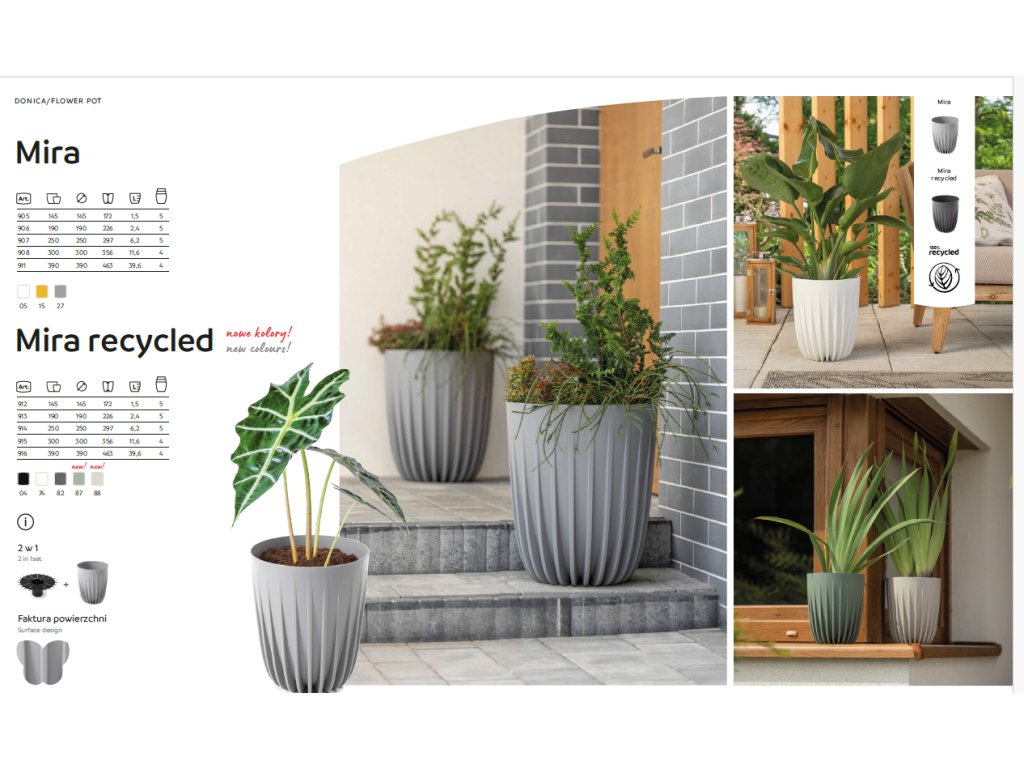 Květináč Mira je odolný proti vlhkosti a povětrnostním vlivům je vybaven speciální vložkou, která umožňuje udržovat dokonalou hydrataci rostlin a květin. Optimální velikost vám umožňuje vysadit do něj i velké keře, takže jej můžete použít k uspořádání malé zahrady na balkoně nebo terase. Originální vzor a moderní barva dokonale ladí s přírodní zelení a vysoce kvalitní plast a precizní zpracování zaručují dlouhé a efektivní používání.