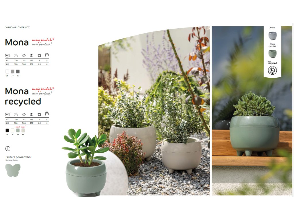 Elegantní a moderní nabídka pro lidi, kteří oceňují harmonii s přírodou a vysokou kvalitu zpracování. Barva dodává prostoru jemnost a hloubku a zároveň je dokonalým pozadím pro rostliny různých tvarů a barev.