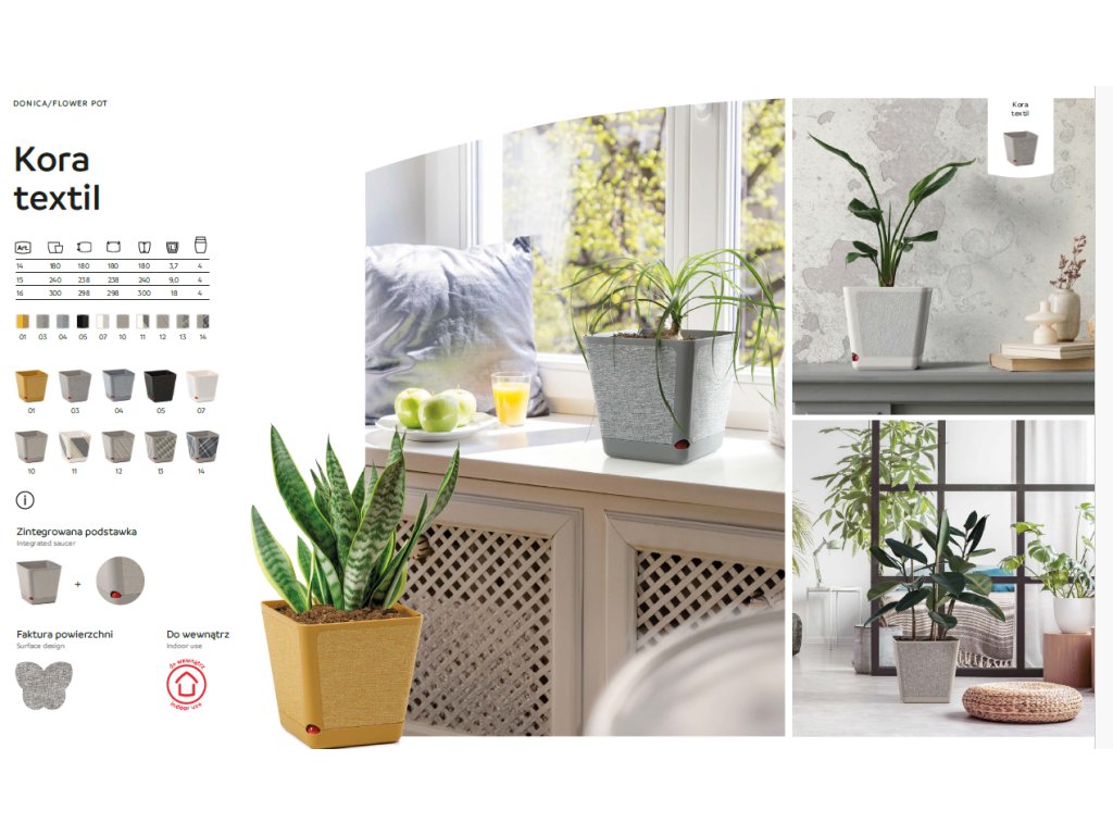 Nová kolekce plastových květináčů Kora s textilií vyráběná pomocí patentové technologie firmy Lamela. Jedná se o novou kolekci květináčů s látkou Gama a Kora. Tkanina je vyrobená z polypropylenových vláken takže je odolná proti oděru, nečistotám, žmolkům, škrábancům a vyblednutí. Velmi snadno se udržují. Materiál je omyvatelný.