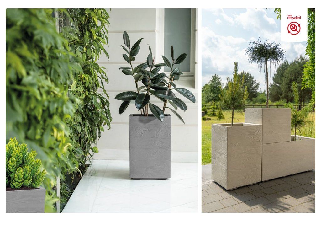 Nová řada ECO wood květináčů je vyrobena z plastu s významnou příměsí dřeva. Každý květináč řady ECO wood obsahuje až 40% dřevěné štěpky.