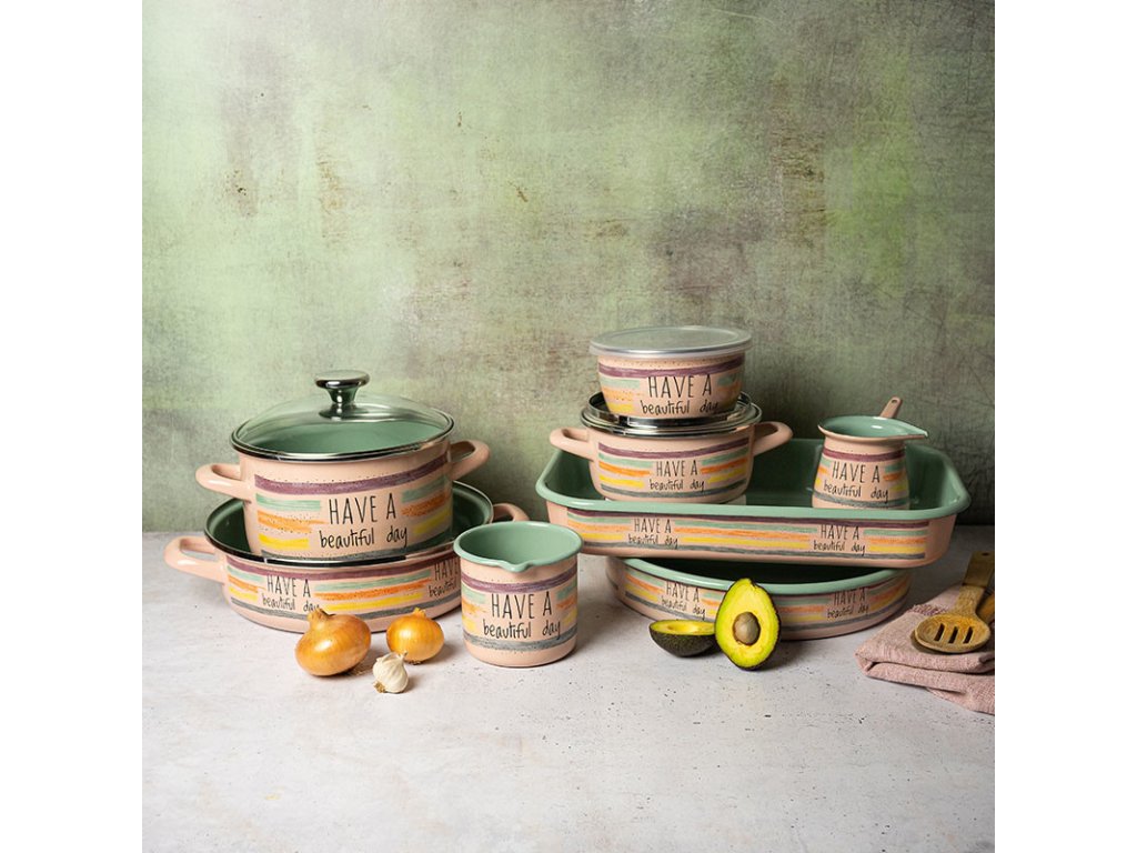 Moderní smaltované nádobí řady Metalac BETTY vyniká líbivou kombinací světle růžového smaltu s pruhovaným dekorem a milým textem, který bude přát každý den krásným. Hrnce jsou dodávány s praktickou skleněnou poklicí, díky které budete mít přehled o tom, co se v hrnci odehrává po celou dobu vaření. K sadě hrnců je možné dokoupit i smaltované hrnky, misky, džezvy či pekáče.