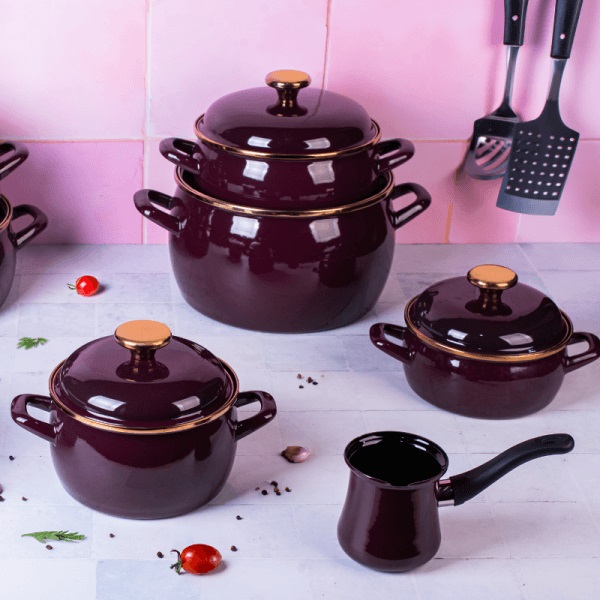 Představujeme elegantní a nadčasovou kolekci smaltovaného nádobí Lux, která vyniká hlubokou bordó barvou a jemným zlatým zdobením, které jí dodává výjimečný charakter. Toto nádobí se skvěle hodí do moderních i klasických interiérů, přičemž je nejen ozdobou kuchyně, ale také funkčním nástrojem pro každodenní vaření.