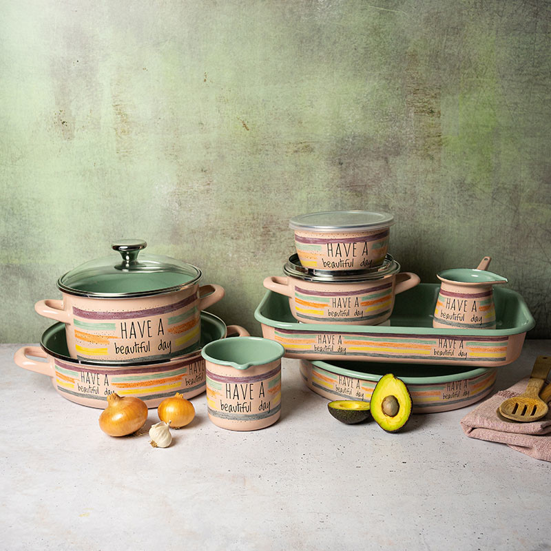 Další z novinek na našem e-shopu je řada smaltovaného nádobí Betty. Moderní smaltované nádobí řady Metalac BETTY vyniká líbivou kombinací světle růžového smaltu s pruhovaným dekorem a milým textem, který bude přát každý den krásným. Hrnce jsou dodávány s praktickou skleněnou poklicí, díky které budete mít přehled o tom, co se v hrnci odehrává po celou dobu vaření. K sadě hrnců je možné dokoupit i smaltované hrnky, misky, džezvy či pekáče.