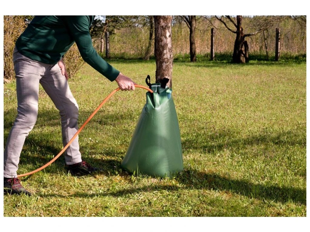 Tyto 75 l zavlažovací vaky na stromy jsou ideálním zavlažovacím prostředkem díky způsobu vypouštění vody v rozmezí 8-10 hodin (otestováno). Tento mobilní zavlažovací prvek s postupným (kapkovým) uvolňováním zálivky je vhodný zvláště pro stromy na suchém stanovišti, stromy rostoucí ve svahu či nově zasazené stromy. Při běžném zalévání se voda nedostává do hloubky. Zavlažovací pytel vodu postupně vypouští pouze v okolí kmene stromu a díky tomu se dostává až ke kořenům.